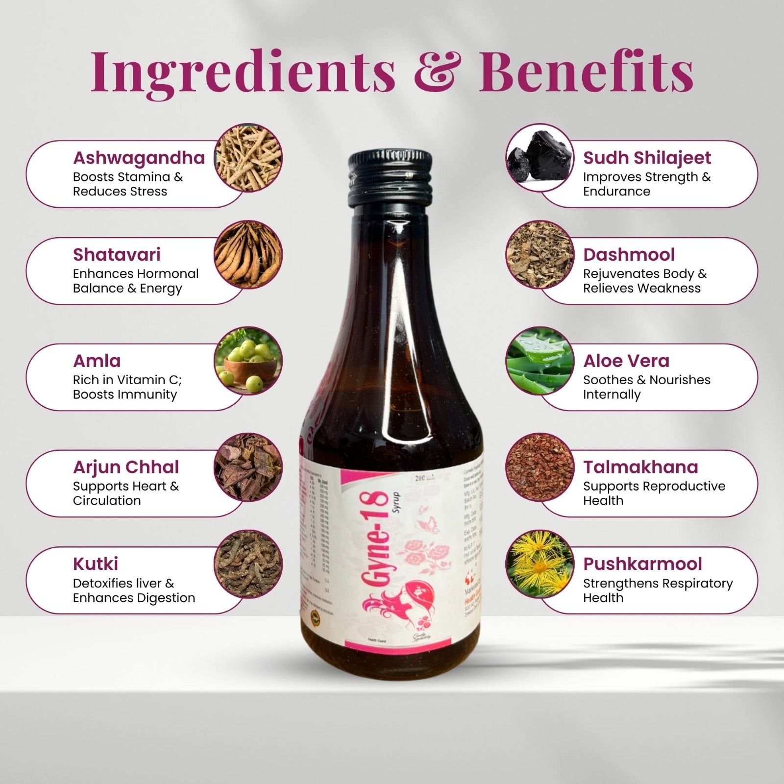 GYNE-18 is a powerful Ayurvedic uterine tonic formulated with a unique blend of time-tested herbs like Ashok Chall, Ashwagandha, Lodh, Satavari, and Shilajit. This natural formulation supports the overall health of the uterus and reproductive system, making it ideal for women facing hormonal imbalance, leucorrhoea (white discharge), irregular periods, or postpartum weakness.