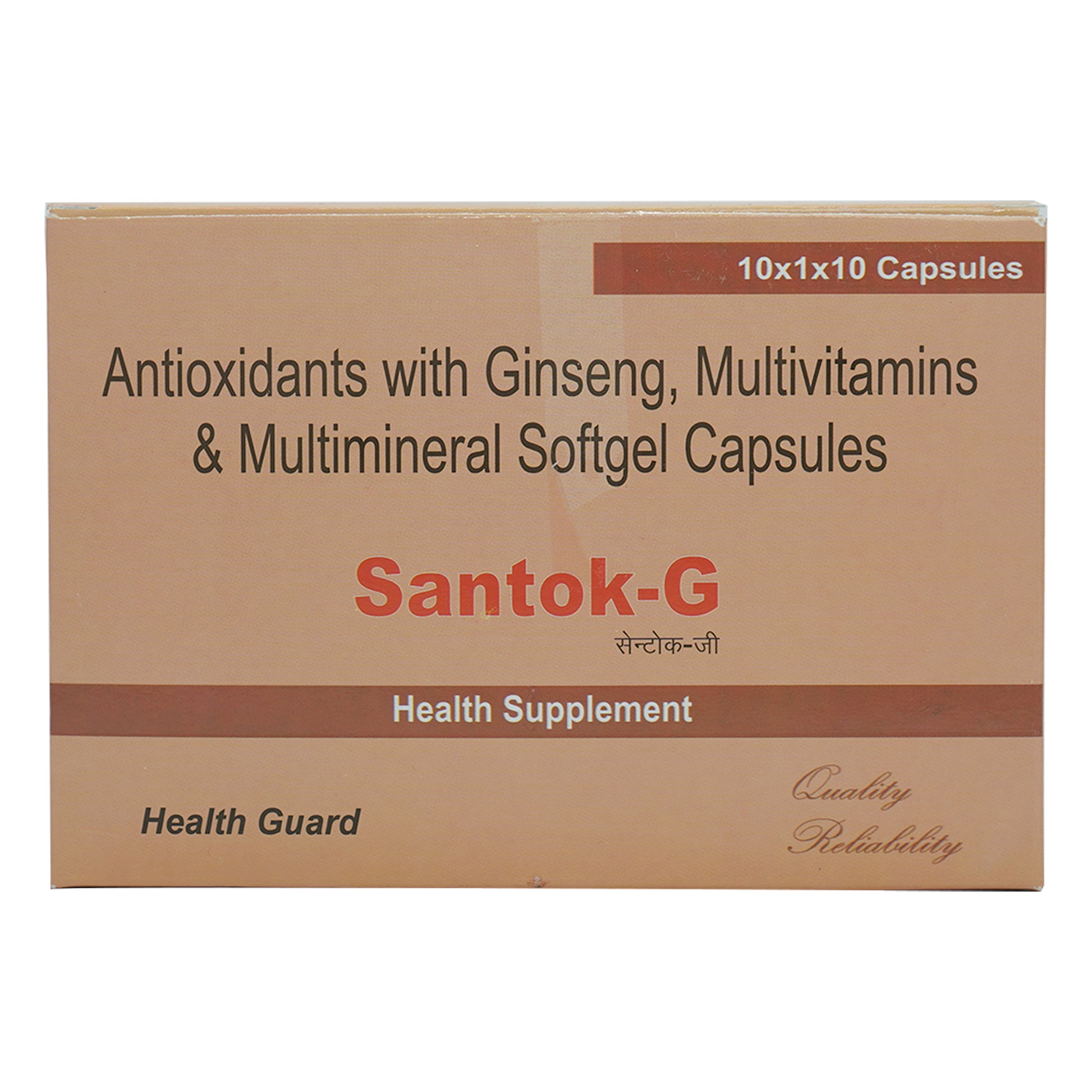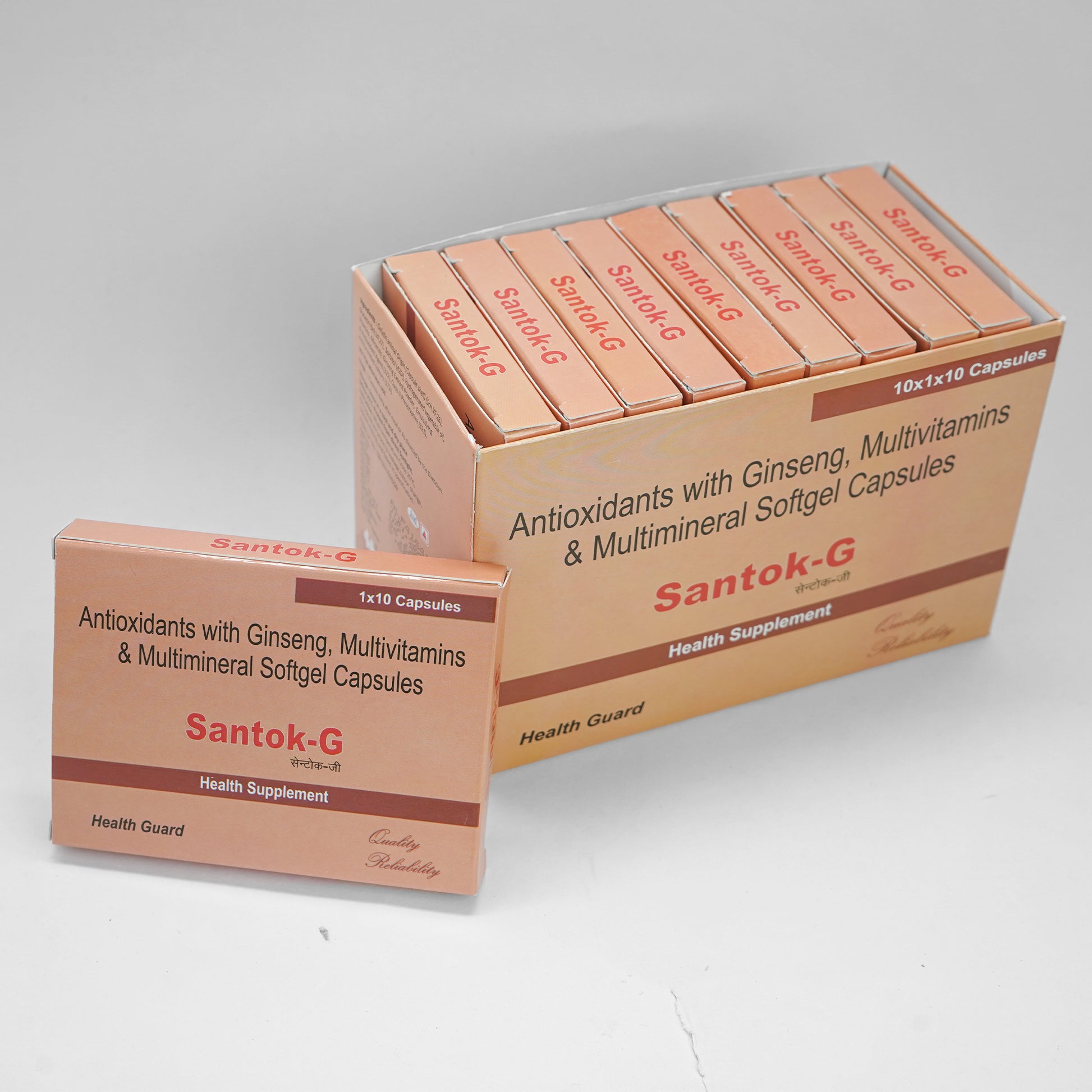 Welcome to SANTOK-G, where health meets vitality! Our Antioxidants with Ginseng Multivitamin Softgel Capsules are designed to empower you with the goodness of nature's finest ingredients. Packed with essential nutrients and the rejuvenating power of ginseng, these capsules are your daily dose of wellness.